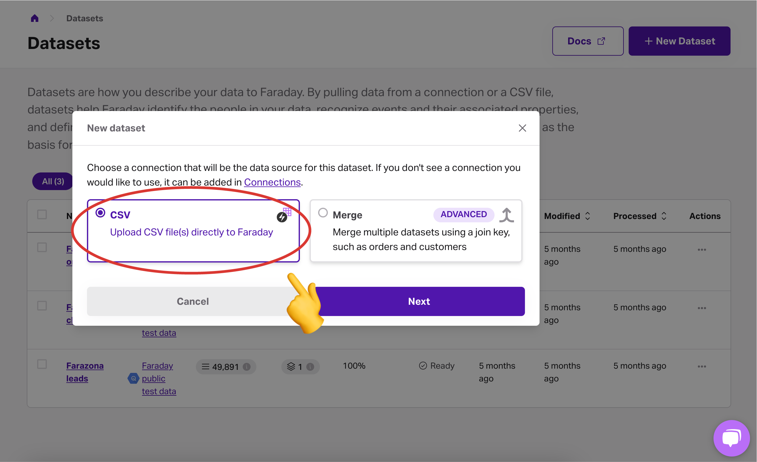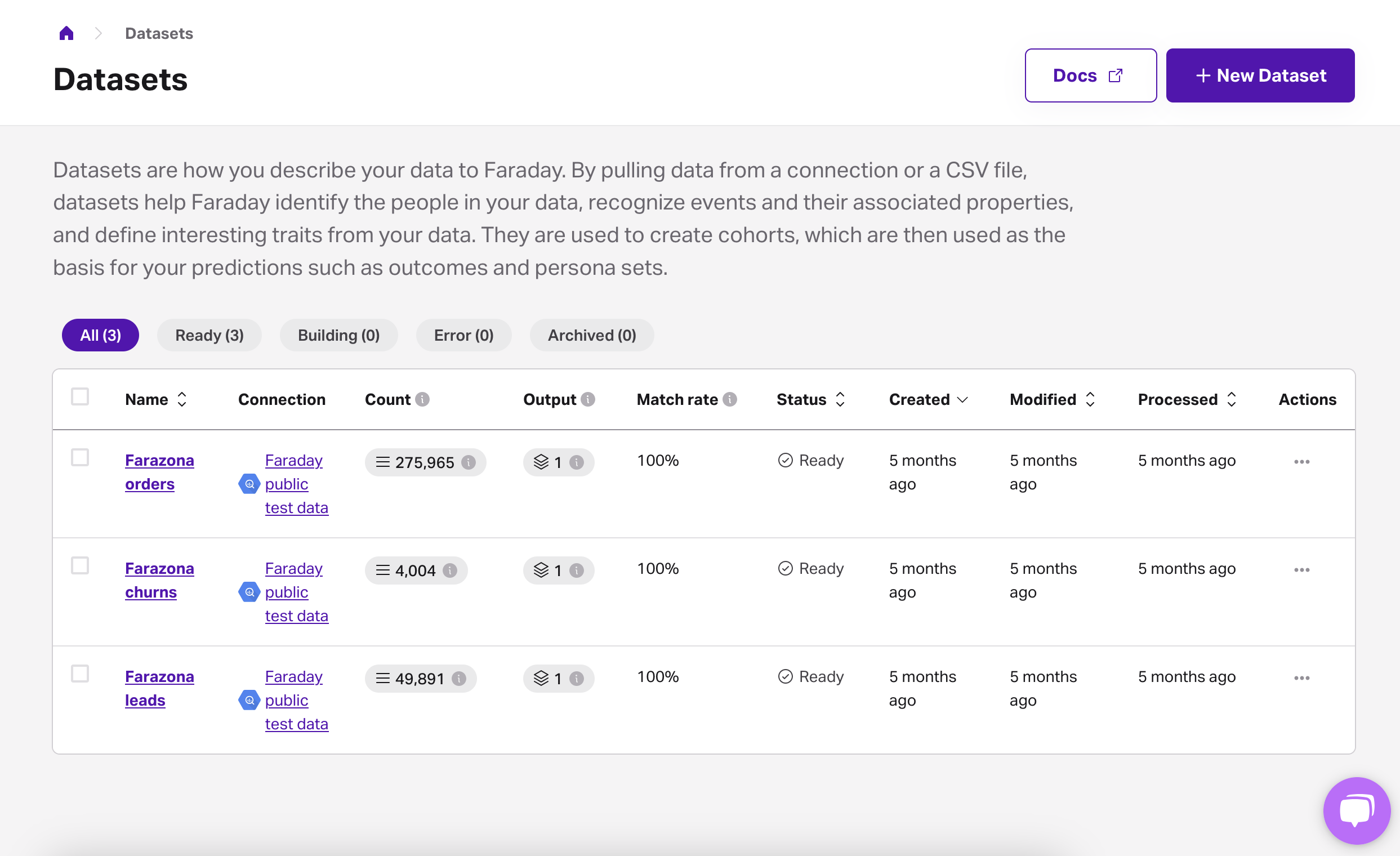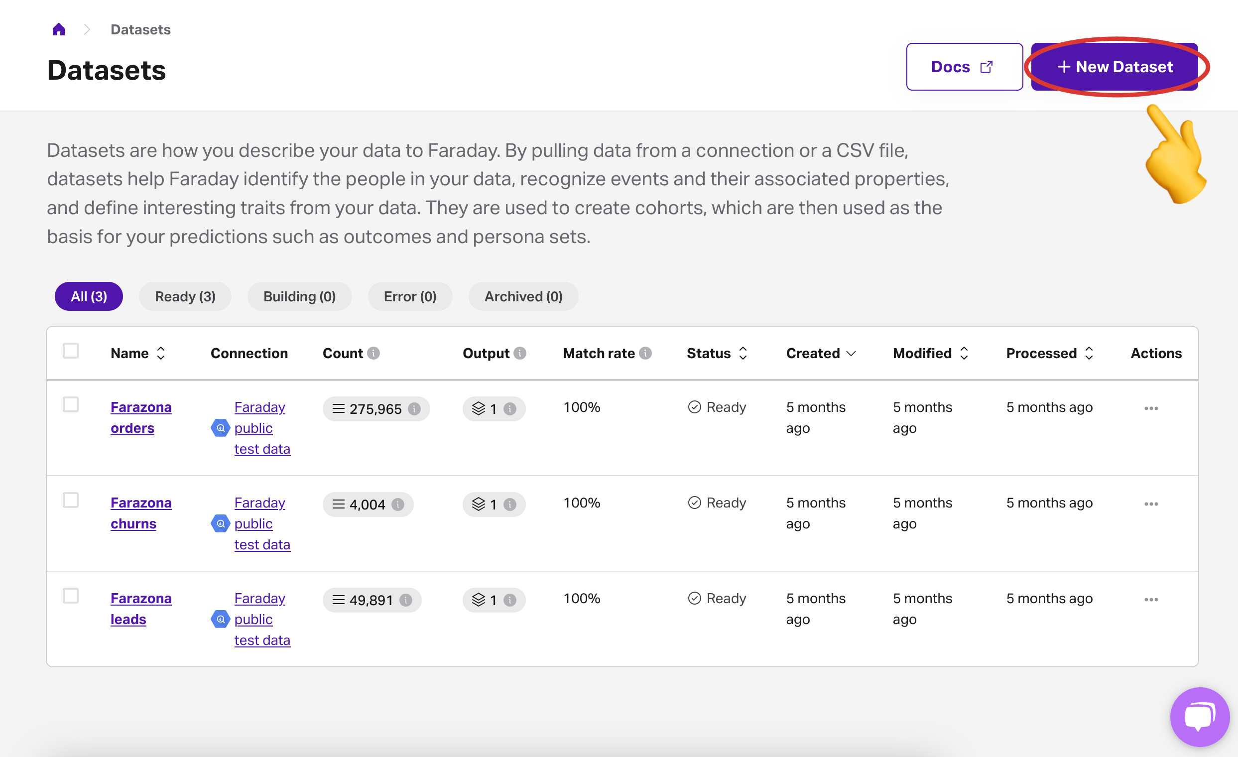 To keep your data safe, always upload it through the Faraday dashboard in the Datasets section. You can also connect your platform to your existing data warehouse, but as this integration is more involved, this step would likely come after your successful validation test has been completed and you’ve decided to sign up with Faraday!