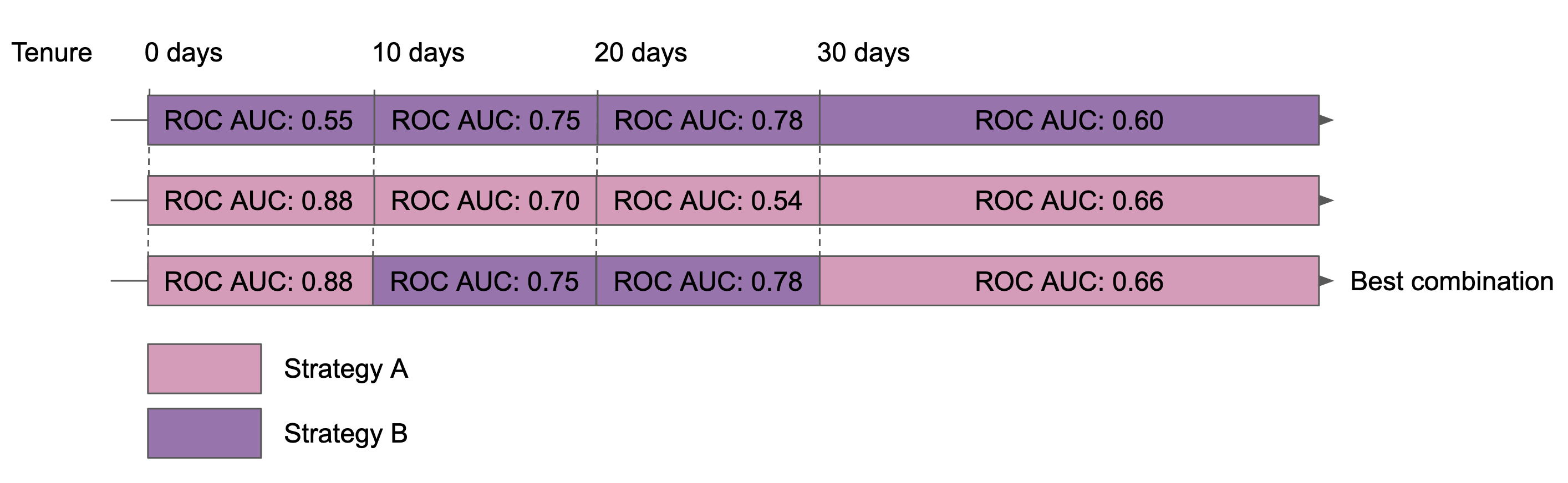 With dynamic prediction, we create predictive models for several tenure bins, or periods of time, that someone has been in the eligibility cohort that you’re using for your prediction (i.e. their funnel stage). Then, we use the best possible model to make predictions on an individual based on that tenure bin. In the below example, you can see two strategies applied (A and B) across four tenure bins (0, 10, 20, and 30 days). In it, strategy A scored higher for the bins of 10 and 20 days, while B scored higher for 0 and 30 days, which means the optimal scoring combination is to use strategy A to score people that have been in the cohort for 0-10 days, strategy B for those in it for 11-20 days and 21-30 days, and A again for those in it for 30+ days.