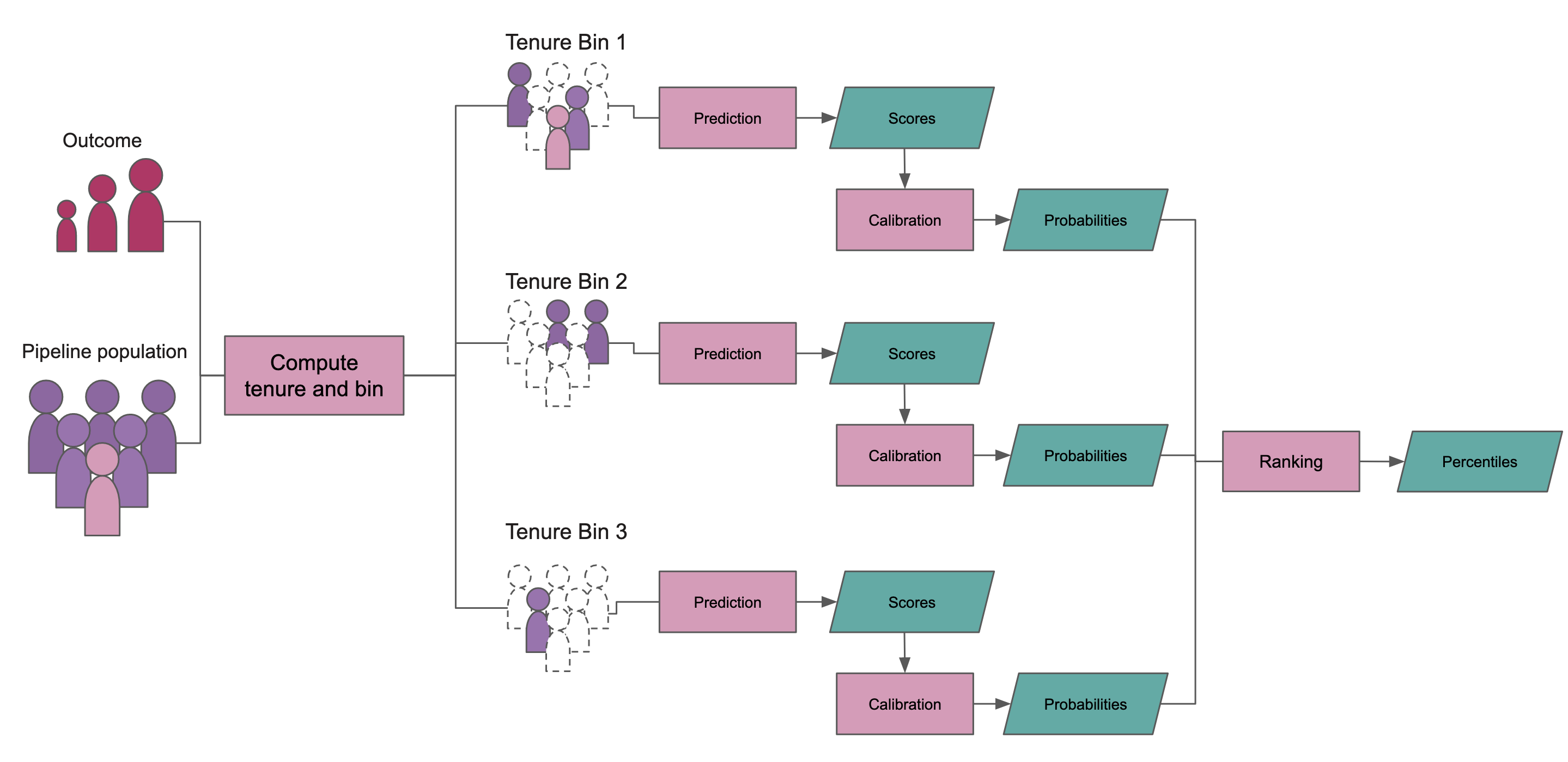 To illustrate this point further, below is an example of a pipeline that uses tenure bins to select the best model for each tenure group. In it, you can see the pipeline population group is broken down into three tenure bins, each of which has a “best” predictive model that’s used for scoring.