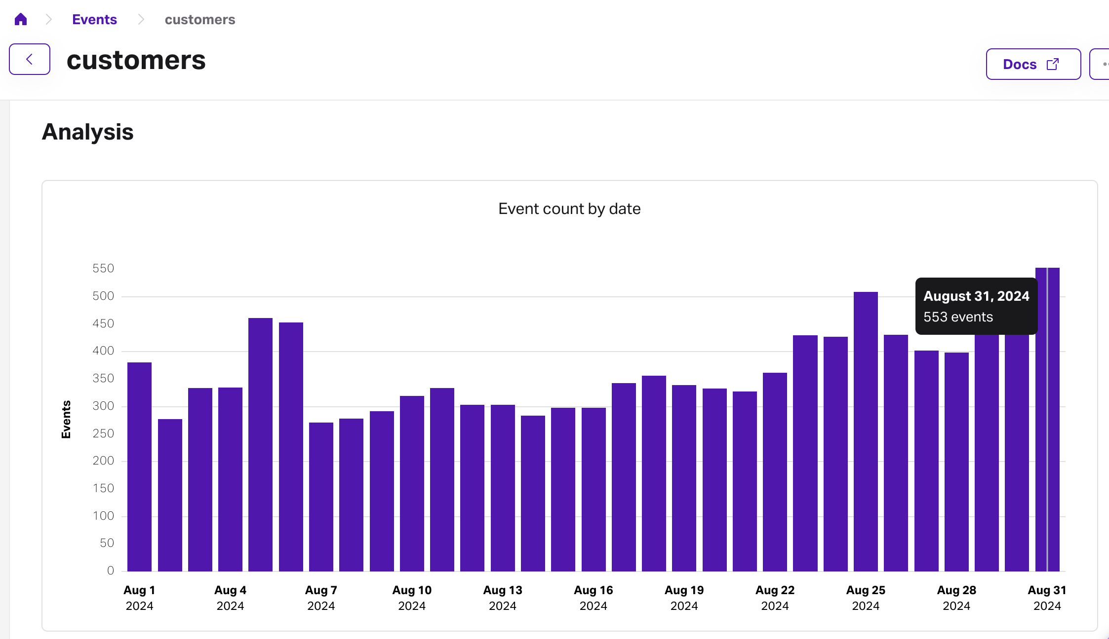 To help alleviate this frustration, we’ve updated the events index view to display the number of events being used in each event stream, when the most recent event was added, and the status of the event stream. Additionally, each event stream now includes an analysis view that indicates these same event counts.