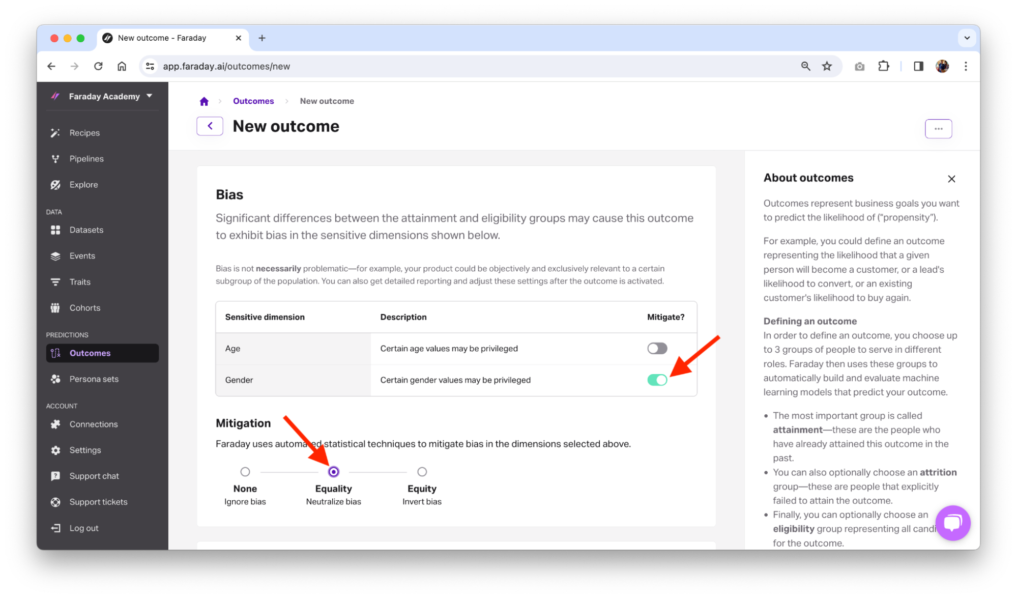 When you define a propensity outcome in Faraday, you can choose how you want the system to handle bias: