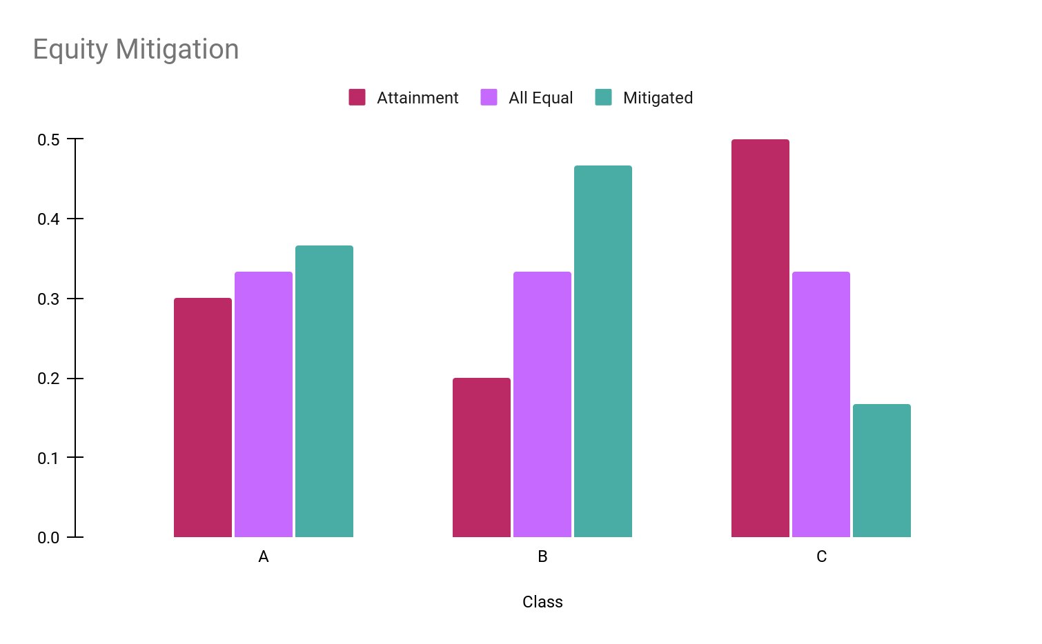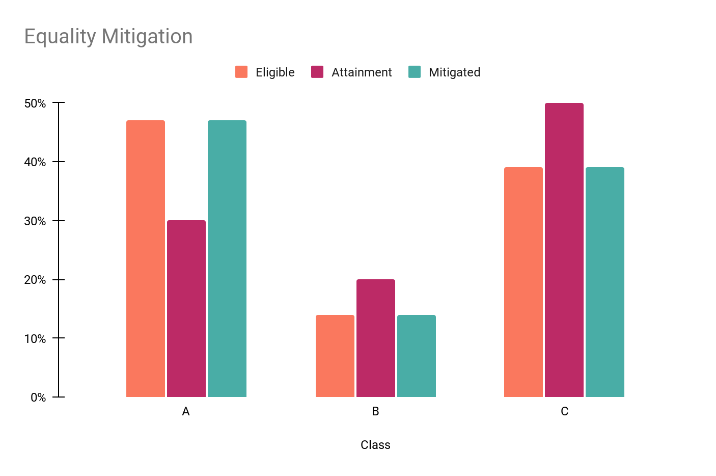 In the example below, the customer group (attainment cohort) consists of 30% of population A, 20% of population B, and 50% of population C. The equity mitigation is going to promote the underrepresented populations A and B at the expense of population C. The target population will contain 37% of A, 47% of B, and 16% of C.