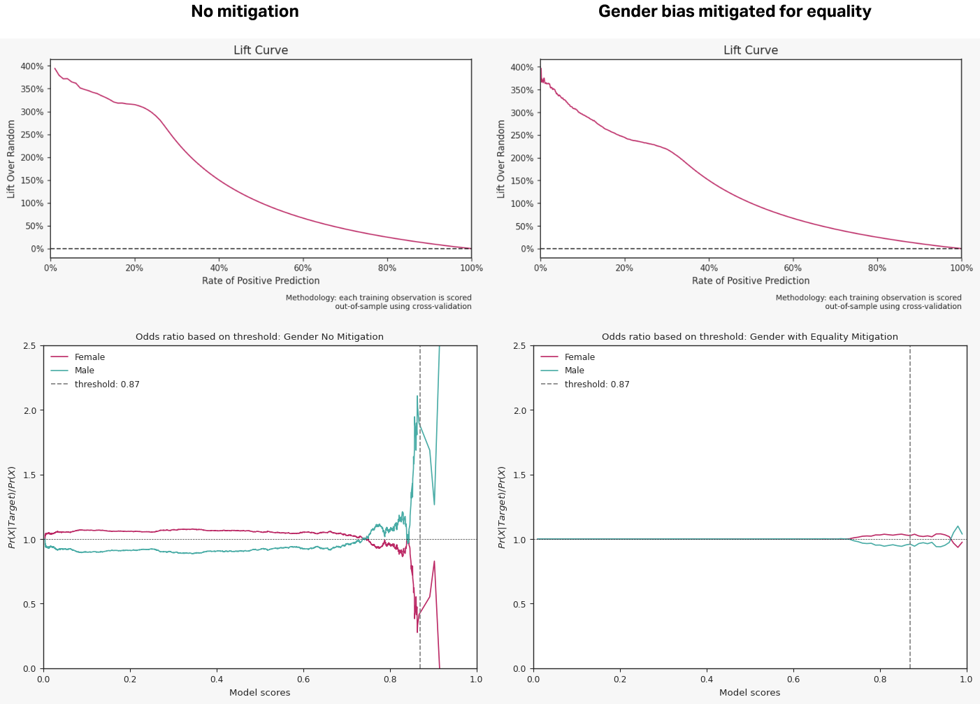 That said, the impact is often small. The top two graphs below depict the impact of equality mitigation on Gender. The lift curve for the un-mitigated model is only slightly better than the one for the mitigated model. The main difference lies in the 20% to 40% score percentile range with lift in that range decreasing from ~300% to ~220%.