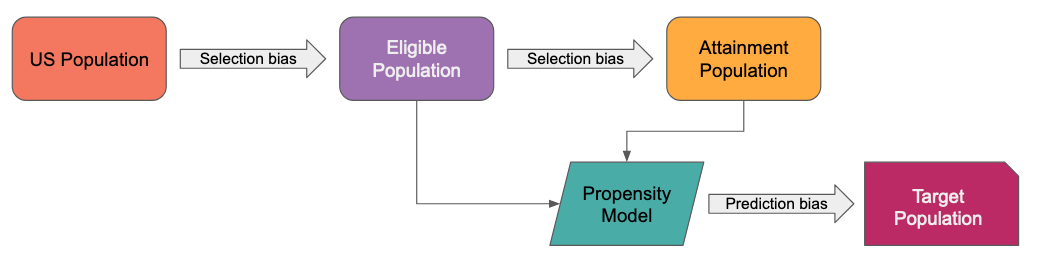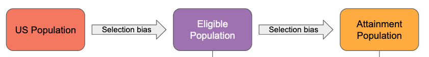 - Data: Measures selection bias in the underlying cohorts used in the outcome. In a Faraday outcome, two labels exist for the purpose of this blog post: positive, or the people from the attainment cohort that were previously also in the eligibility cohort, and candidate, or the people from the eligibility cohort.