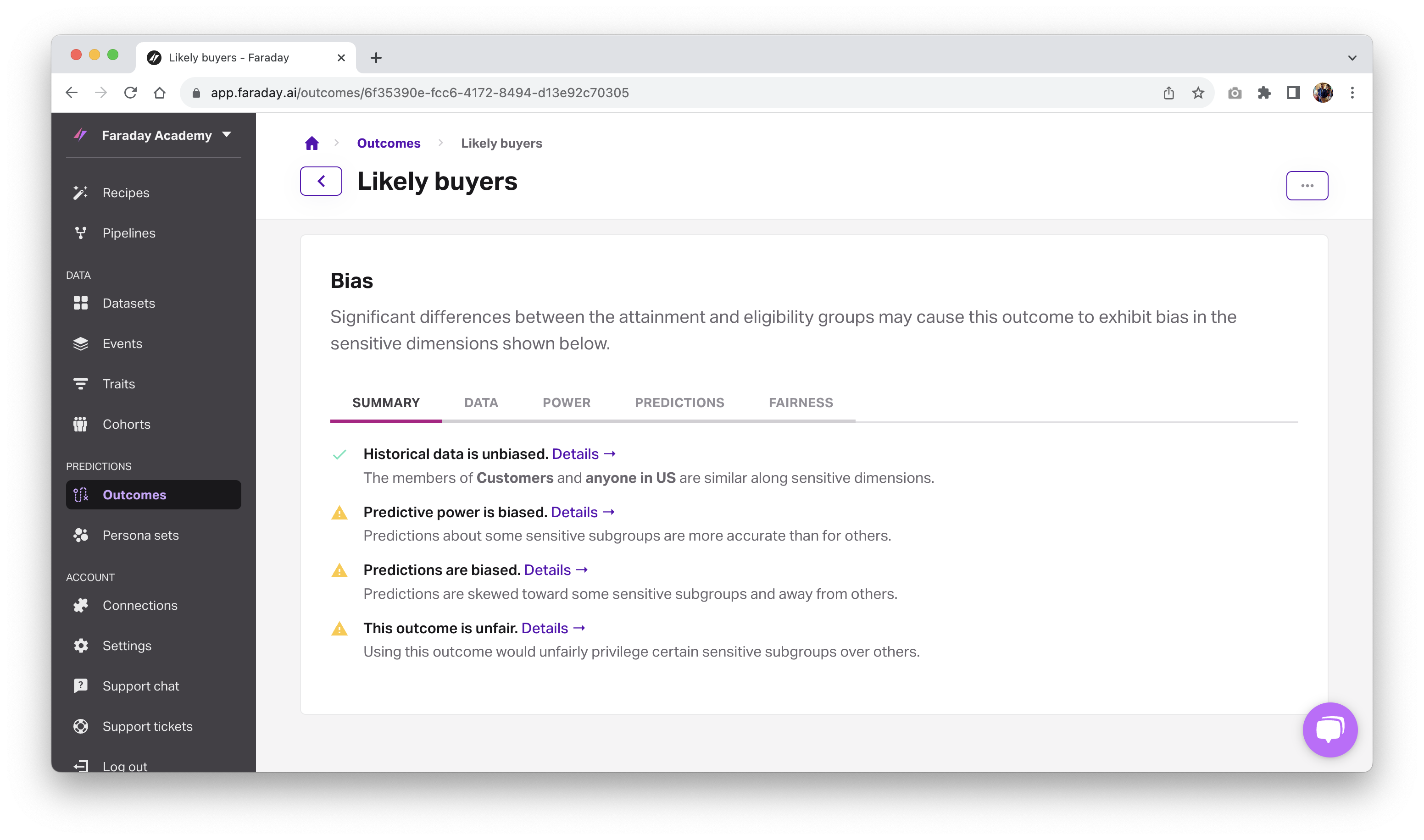 The above examples detailing bias reporting were given in terms of the Faraday API, but these same metrics can also be accessed via the Faraday UI. When you navigate to the outcome you're interested in, scroll down to the bias section to see the breakdown of bias discovered in the data, power, predictions, and fairness categories detailed above.