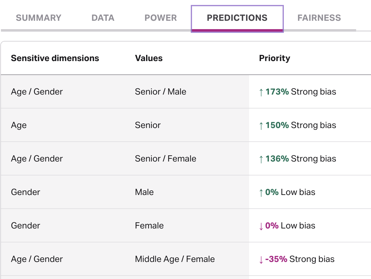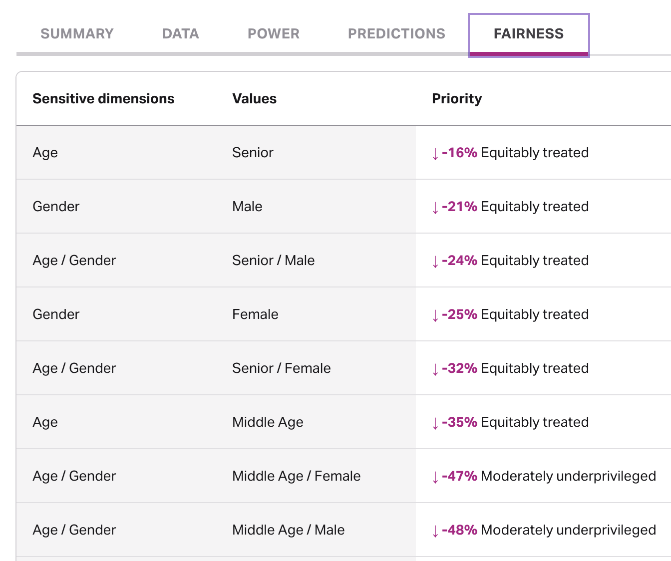 - Fairness: Measures overall fairness using a variety of common fairness metrics in the literature. For example, Faraday will look at whether or not the subpopulation "Senior Male" is privileged or underprivileged.