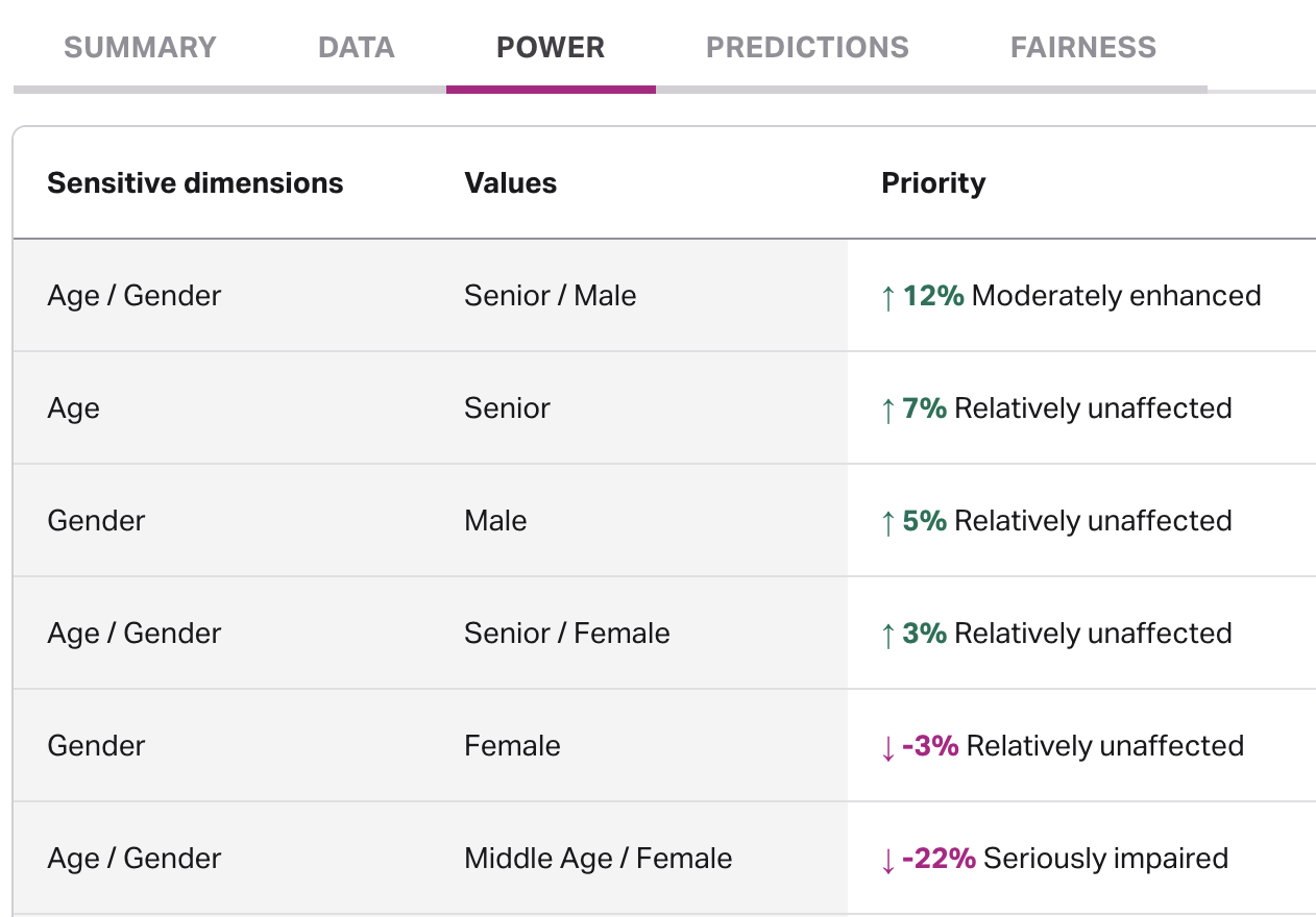 - Power: Measures outcome performance on a subpopulation compared to baseline performance–for example, Faraday will compare how well the outcome performs on the subpopulation “Senior, Male” compared to everyone else.