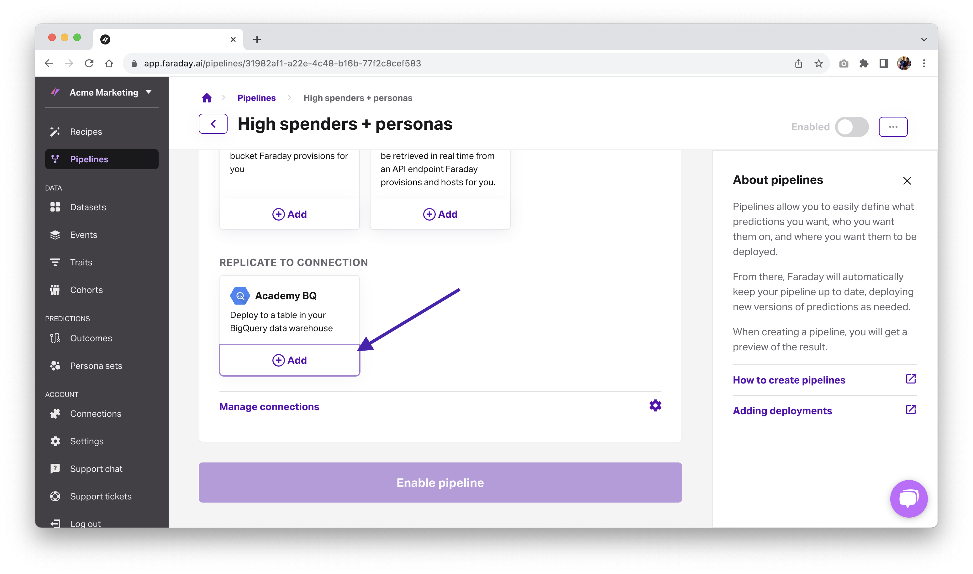 Now that you’ve applied your high-spender predictions and personas to your customers, create a deployment to sync them to your data warehouse.