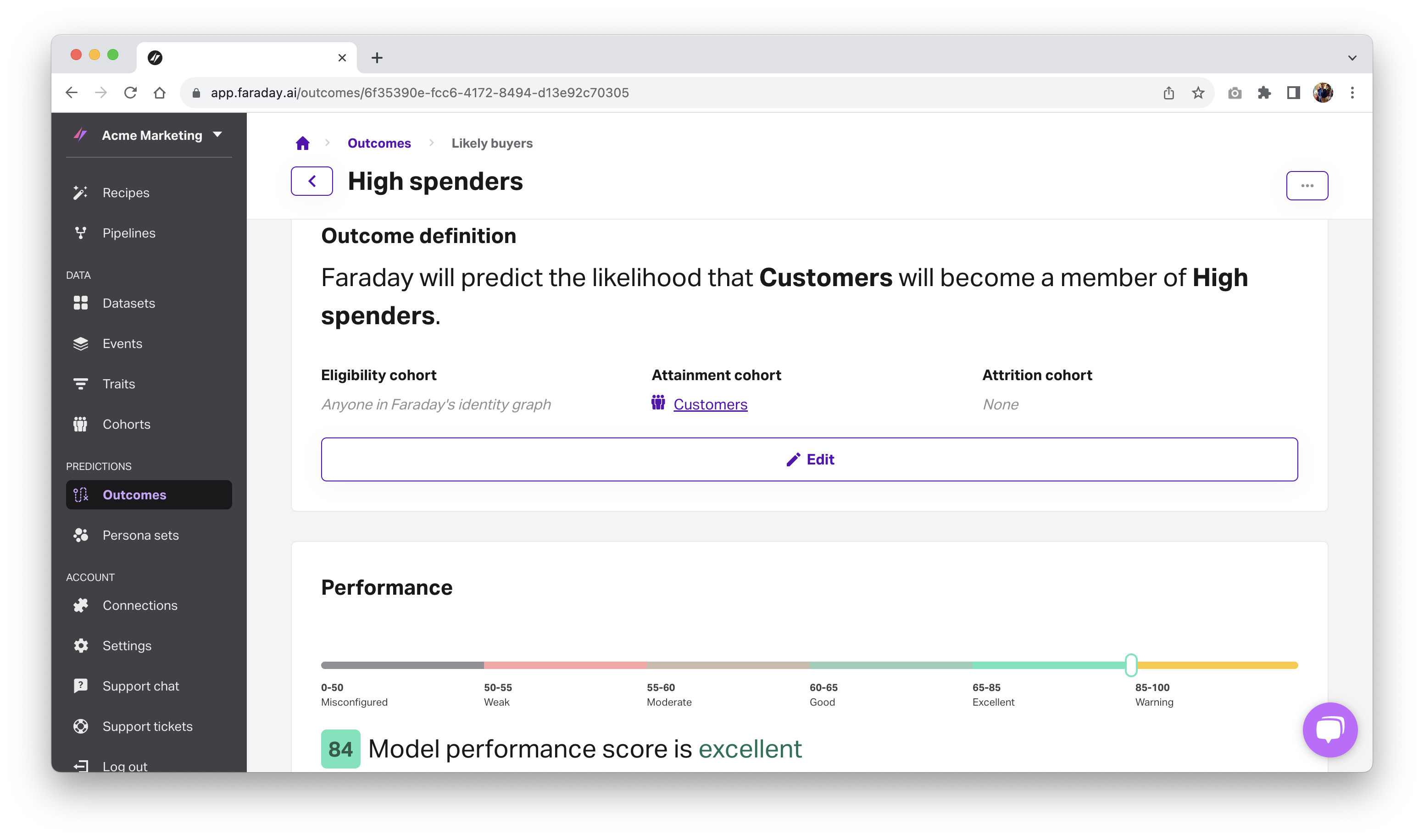With your data in Faraday, you’ll build an outcome to describe the predictions you want to make–high spender scores, in this case. You’ll plug in your customers cohort and your high spenders cohort so that Faraday will predict how likely people in the former will enter the latter by spending big.
