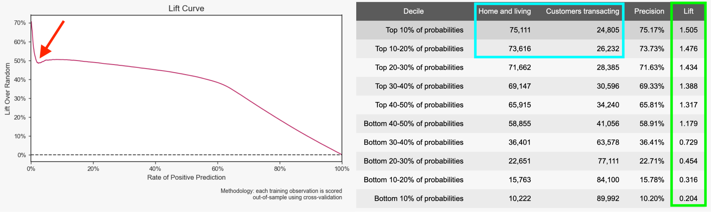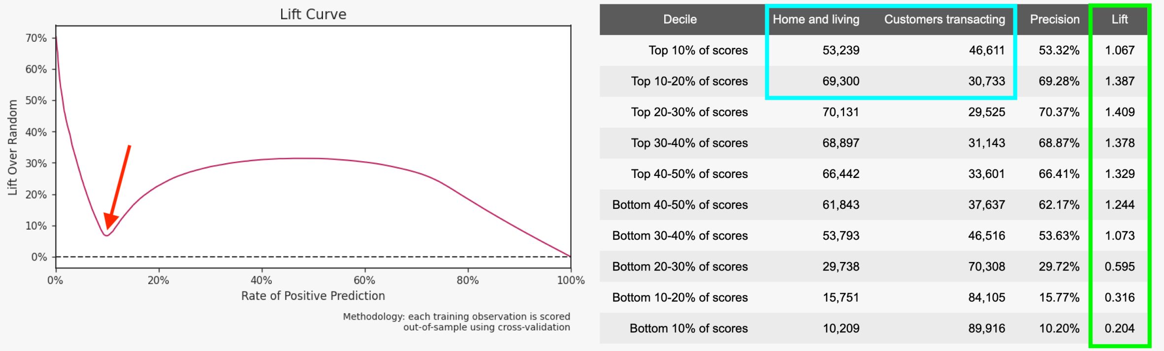 Now, with model calibration implemented in the below graphic, the lift curve’s dip (red arrow) is much less significant for the top deciles, resulting in an outcome that has a higher positive attainment (blue square) in home and living.