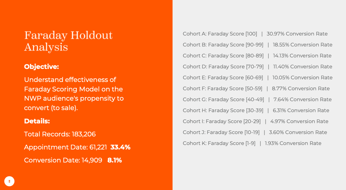 To validate the accuracy and effectiveness of Faraday's lead scores, the home improvement brand engaged the agency Bold Orange to conduct a thorough analysis of the efficacy of the predictive lead scores, comparing Faraday model predictions against actual lead conversions and outcomes.