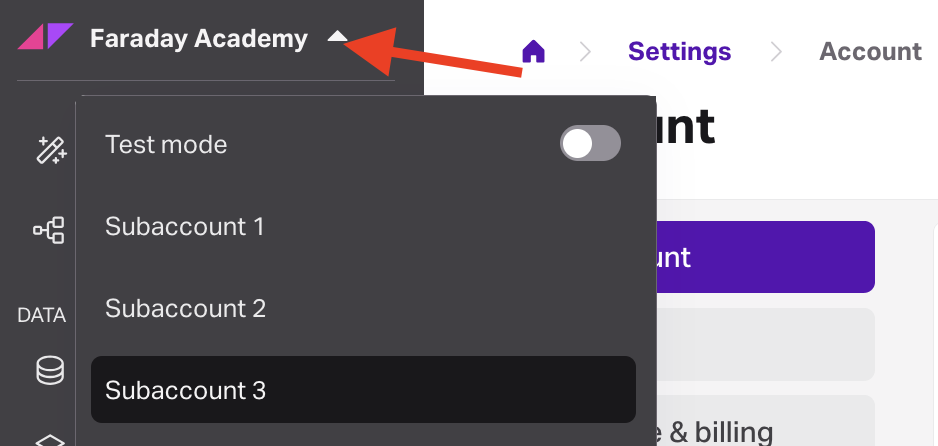With these three steps done, your new subaccount will be accessible via the account switcher in the upper left corner of the Dashboard.