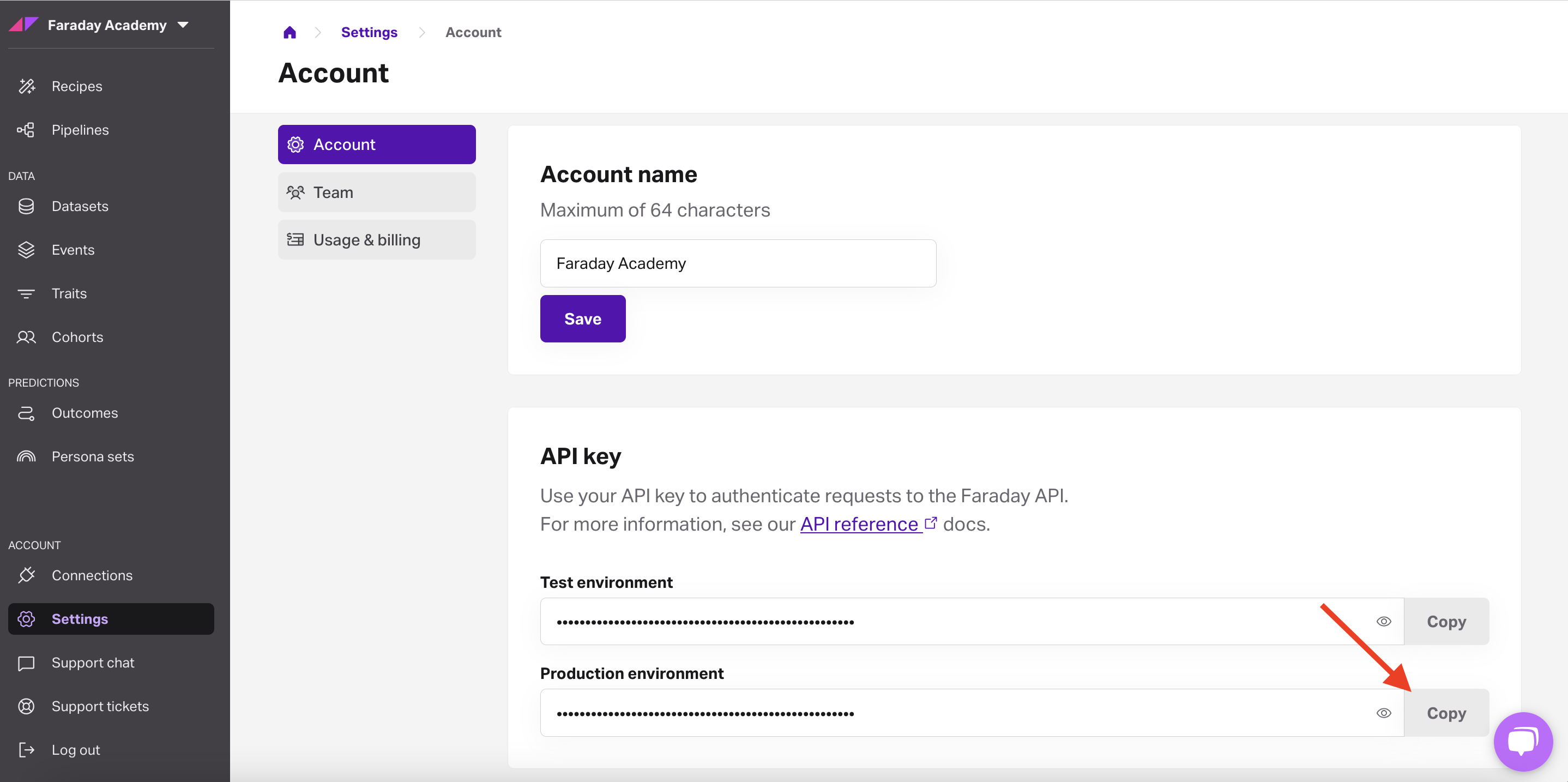The first thing you'll need in order to create a subaccount is your Faraday API key. You can find this in the Faraday Dashboard, under Settings in the left-hand nav, then Account. Click copy next to production environment.