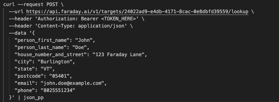 https://api.faraday.ai/v1/targets/<YOUR_TARGET_ID>/lookup - Your production API key (a.k.a. your token)