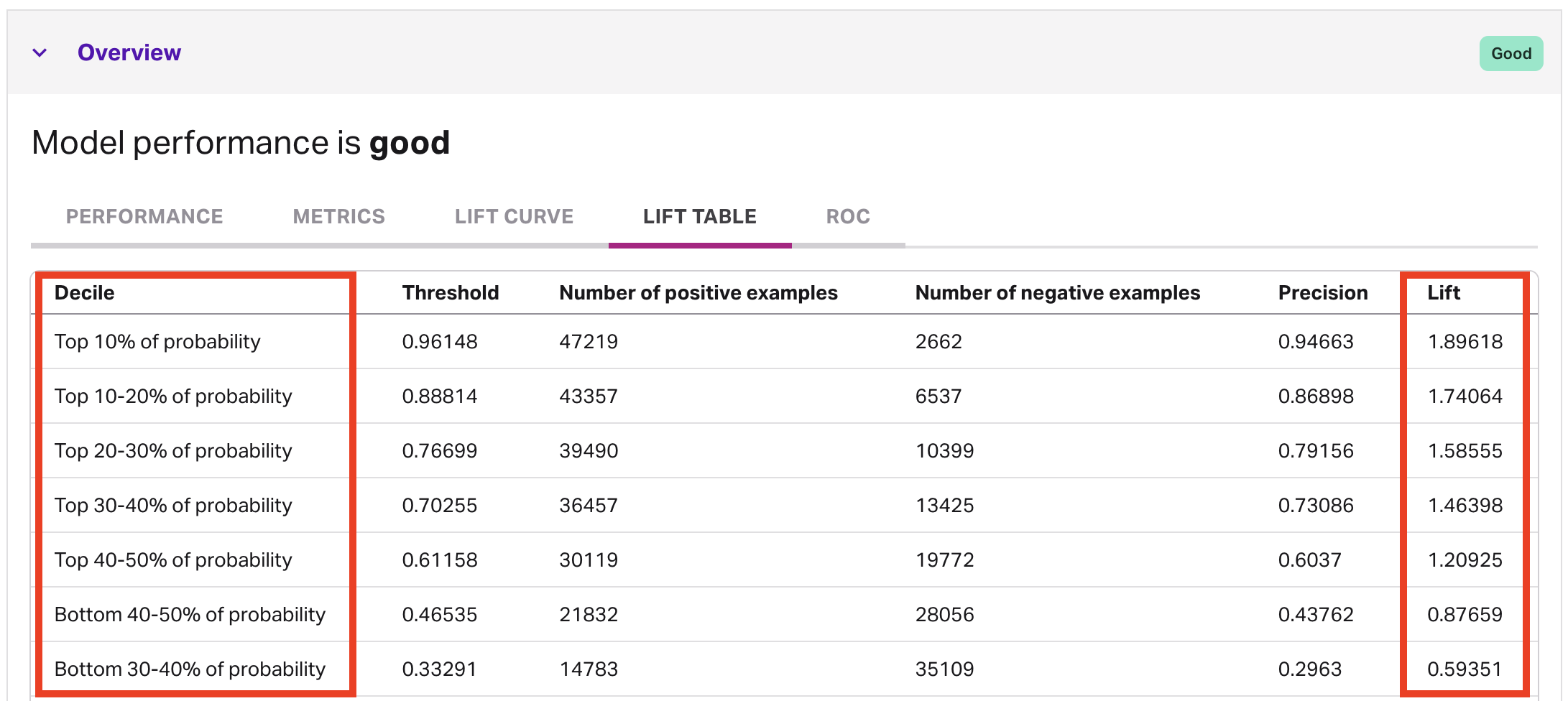 In the lift table, you’ll find performance broken down by probability range into 10 groups, or deciles. The table sheds light on how likely people in each decile are to attain the outcome, including in comparison to that average attainment rate. The comparison of a given decile’s attainment rate to the average attainment rate is called lift, which you can see in the rightmost column. The higher the lift, the better the performance.