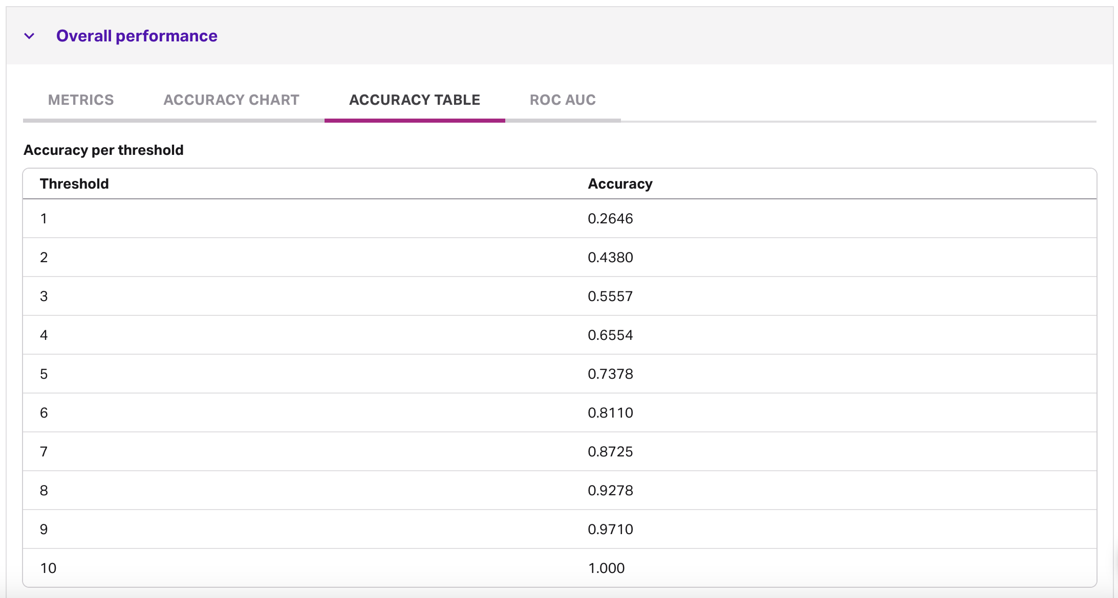 Looking at a recommender’s accuracy table, accuracy refers to how often the observed property is contained in the “top X” recommendations.