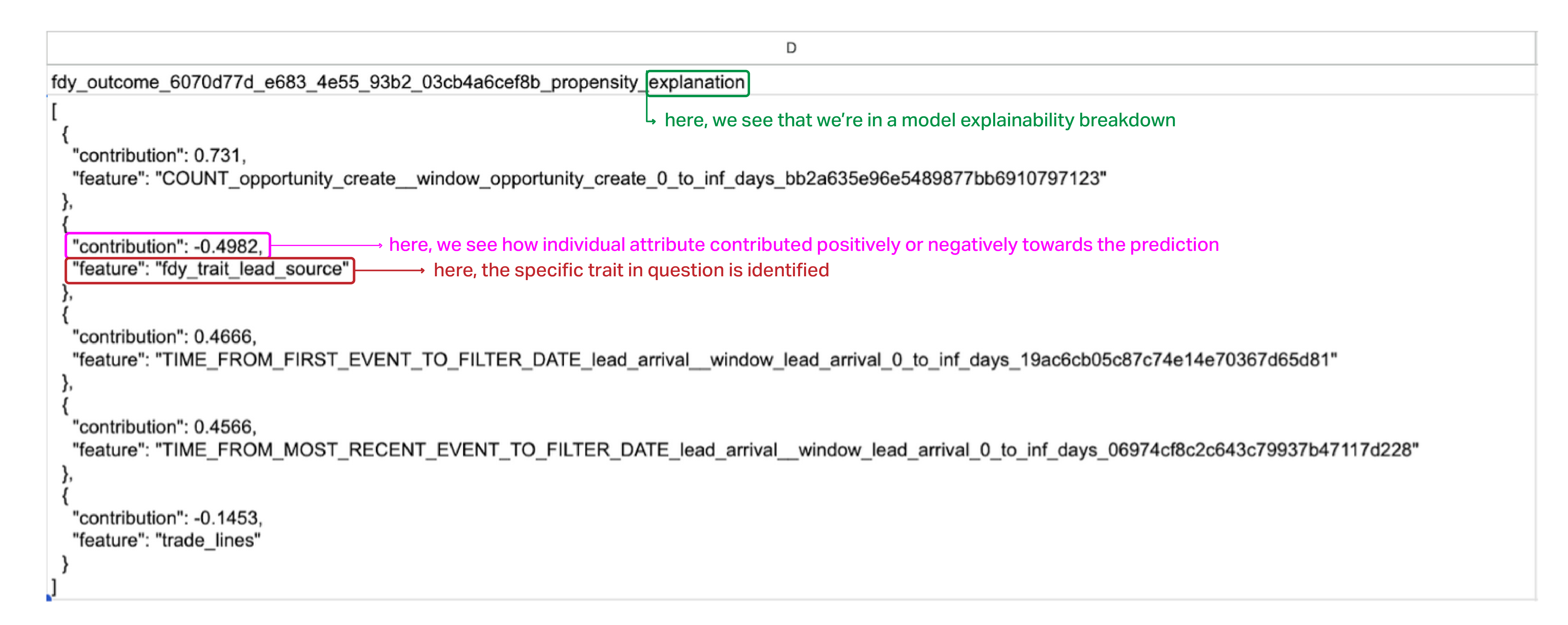 When enabled, explanations provide a breakdown of which traits had the biggest impact on a person’s prediction. You might see that homeownership, household size, or a specific behavioral indicator pushed a score up or down.