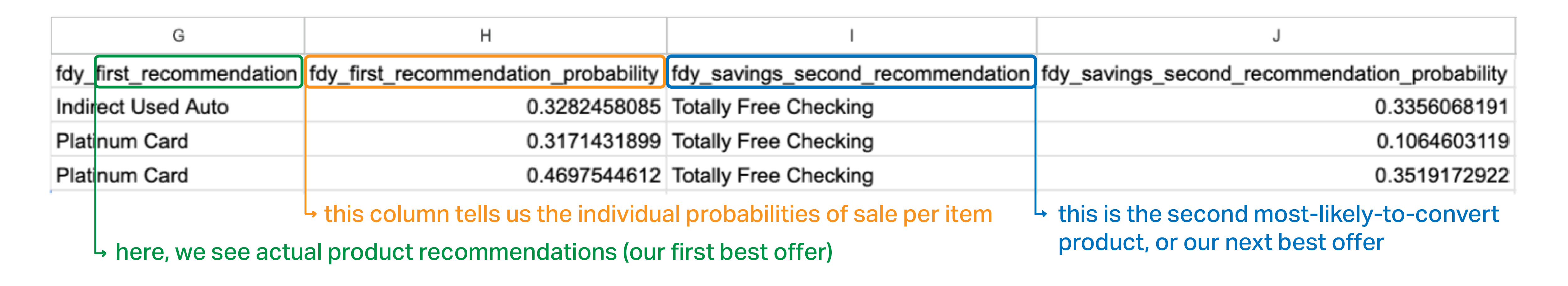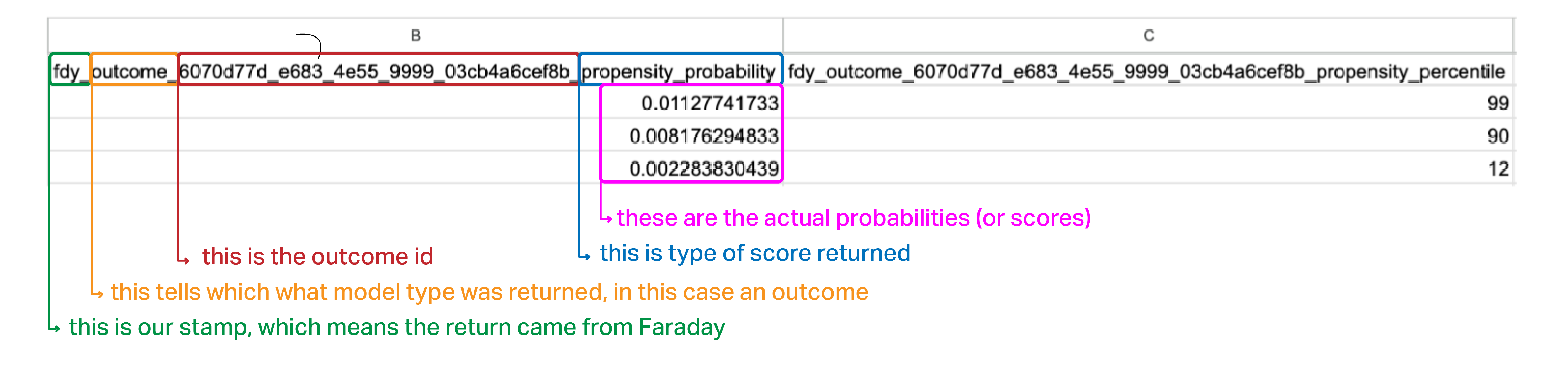 Below is an example of an output that you could expect to see when you request a probability or propensity outcome. These returns can look a little intimidating if you haven’t read one before so lets break down what you’re looking at.
