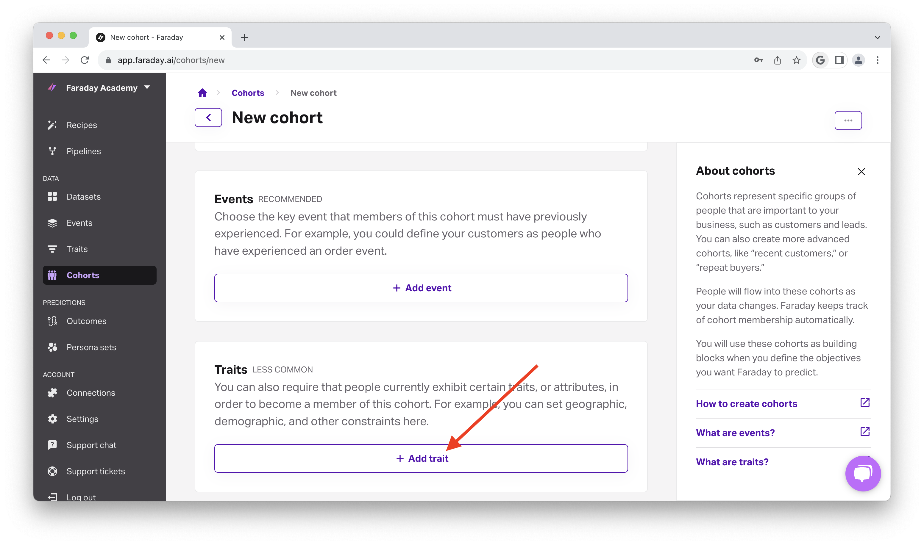 Navigate to cohorts via the menu bar on the left-hand side and click + New cohort in the upper right.