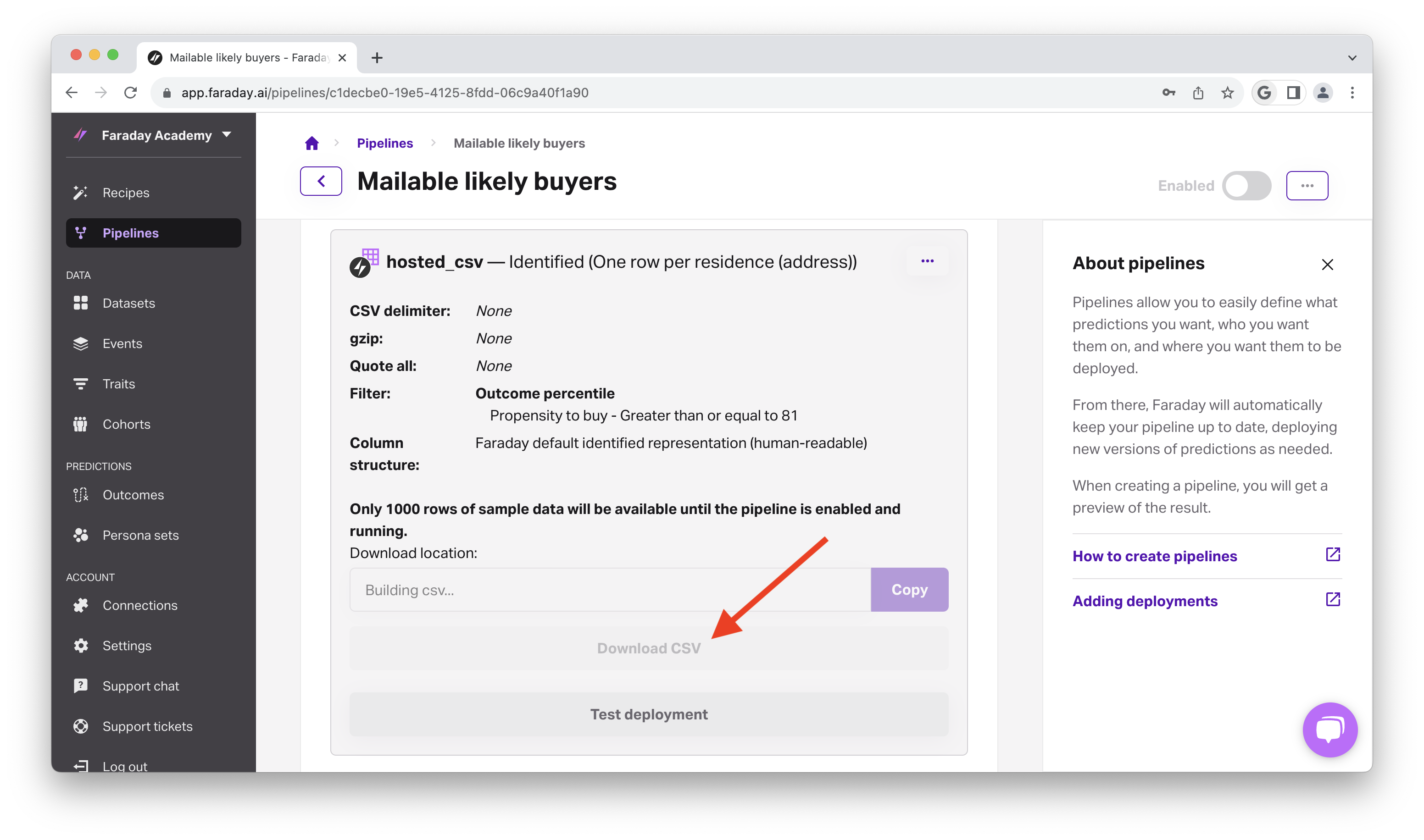 - Last, click finish to complete the deployment, after which it will begin building. We can use the download button to download the CSV of a completed deployment for upload into our direct mail platform, which will include the top 20% of likely buyers that are able to receive mail in the country, (optionally) with their predictive personas included so that we can tailor copy & creative appropriately.
