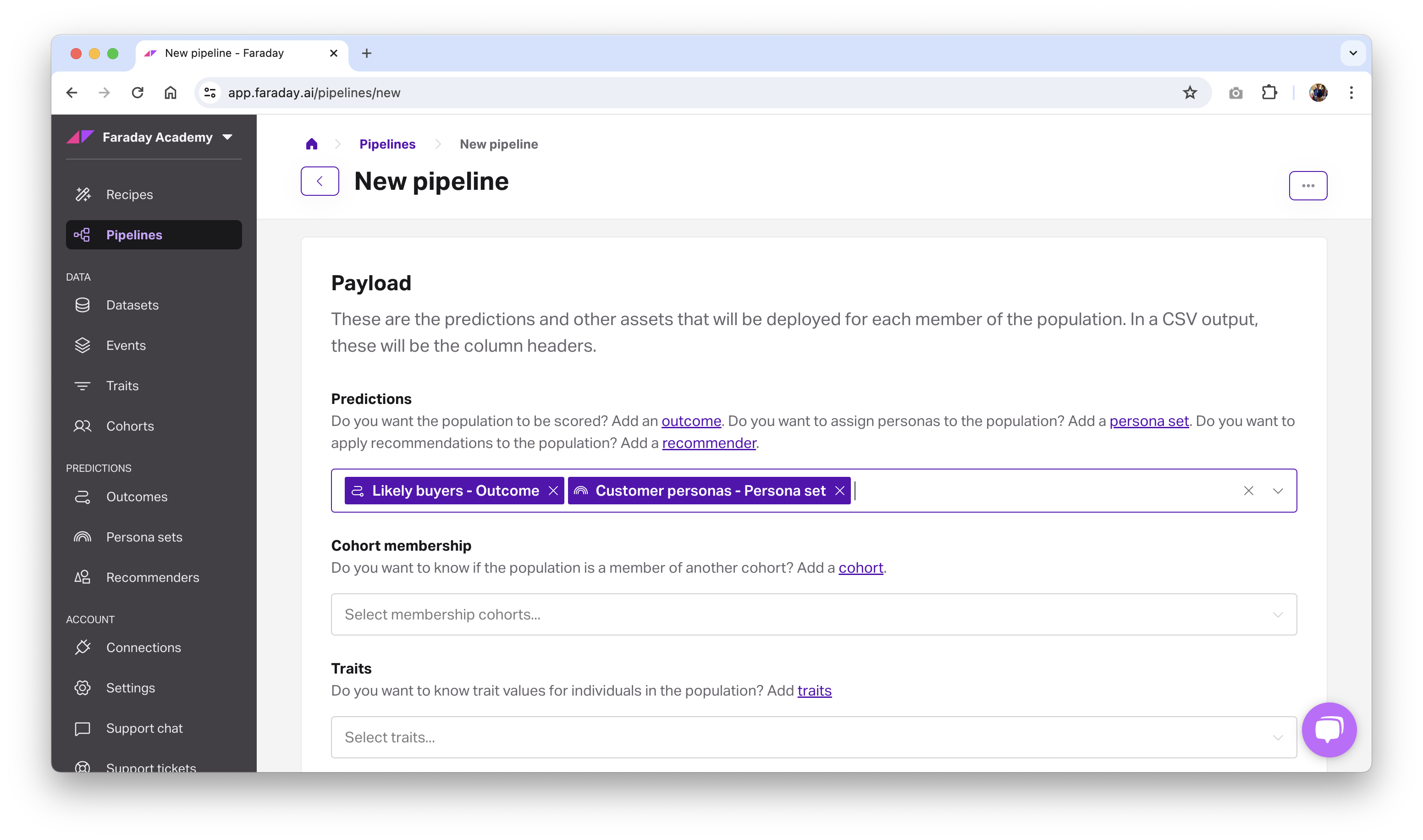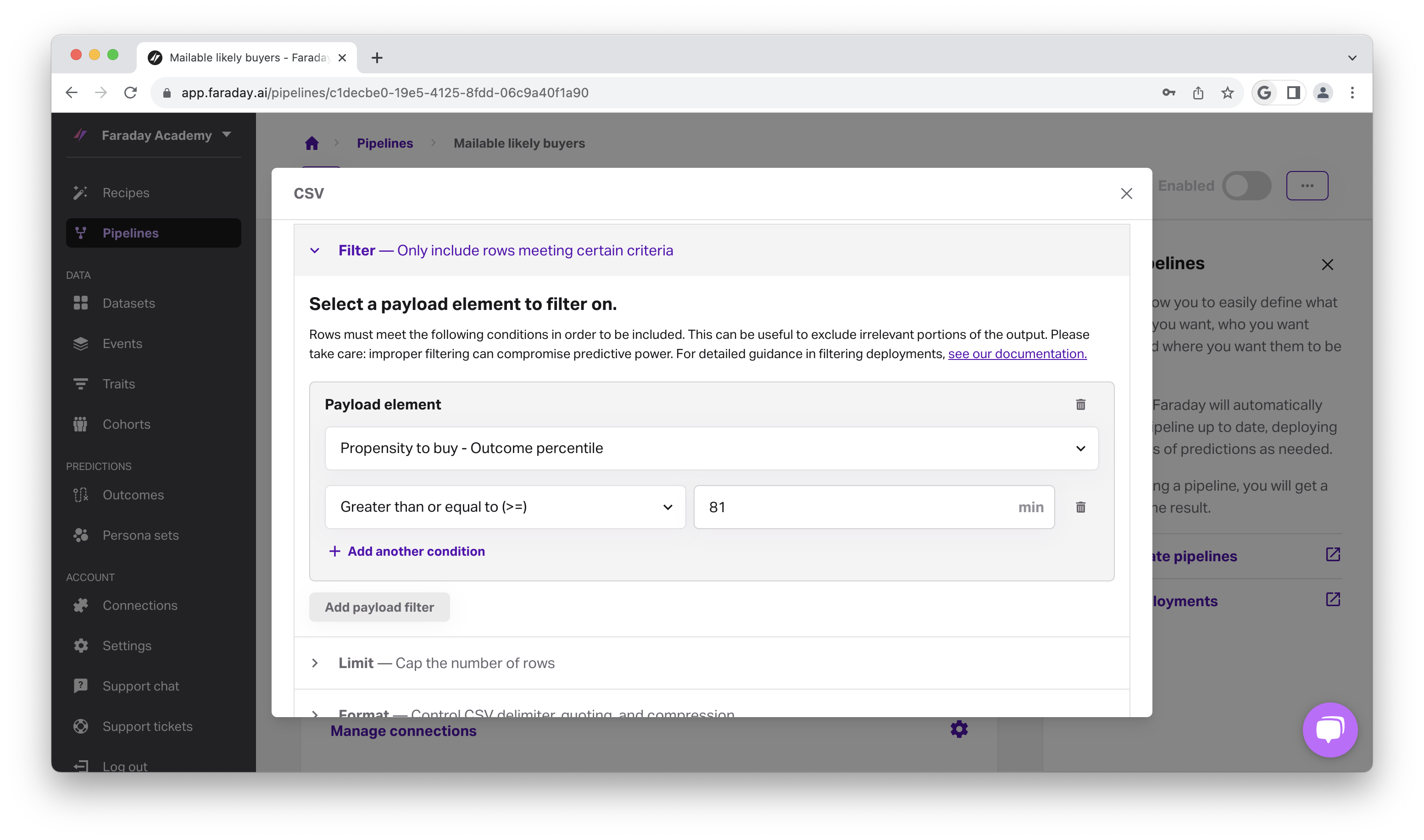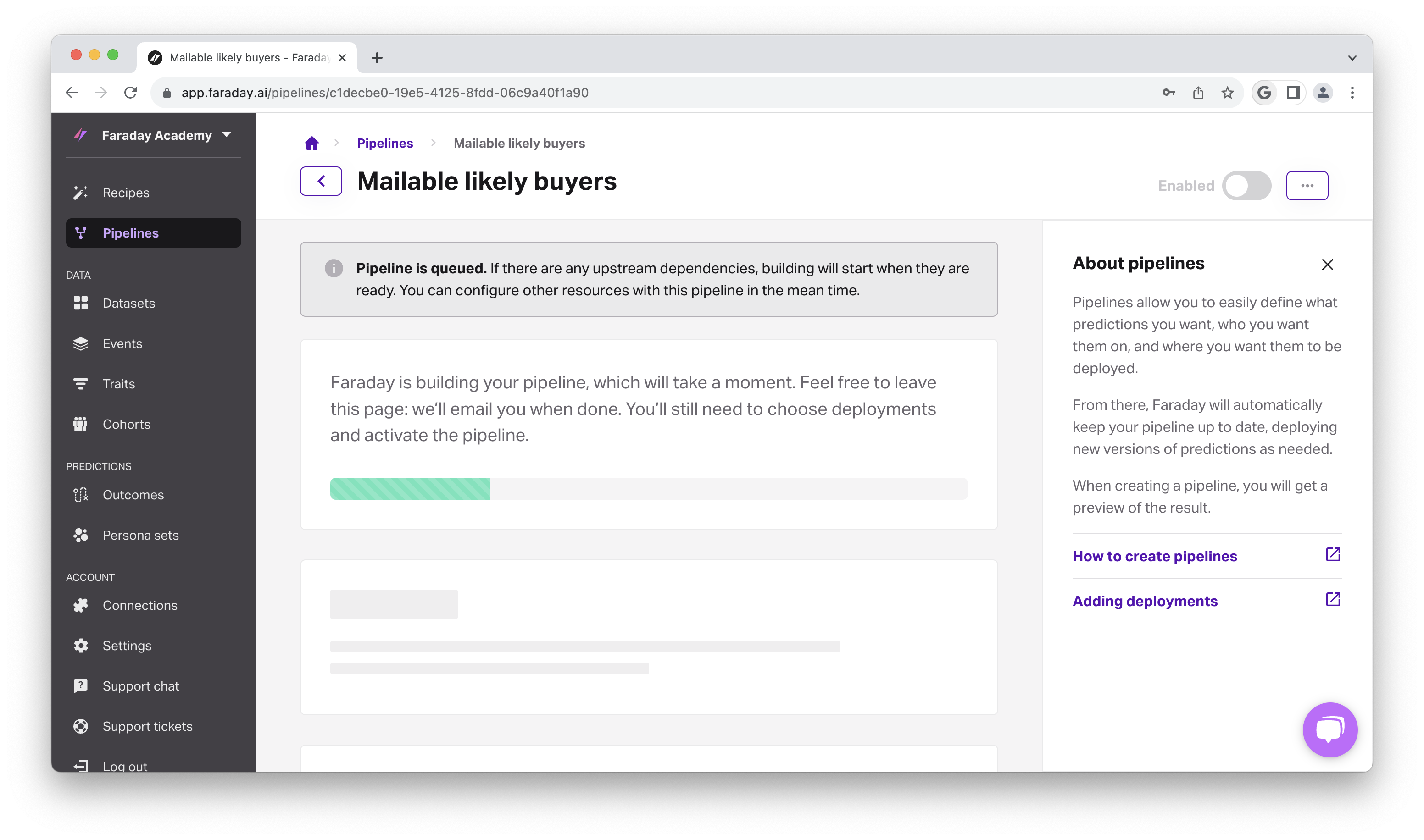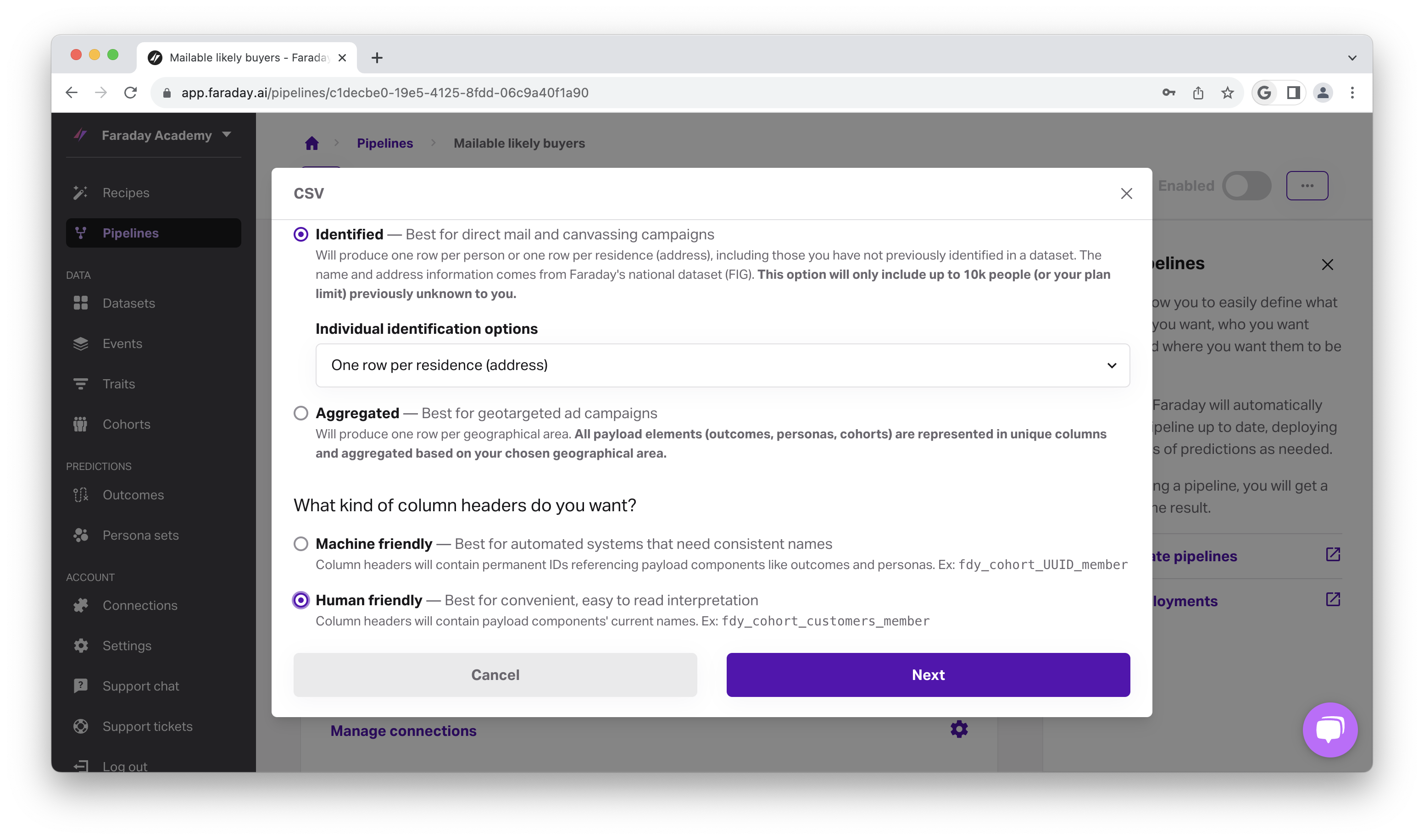 While our Direct mailers cohort is building (if we select it in a pipeline, the pipeline will build once the cohort is ready), we're ready to create a pipeline and deploy it via CSV, which will let us plug our direct mail cohort right into our preferred mailer platform. For a more detailed look at creating a pipeline, check out the pipelines documentation.