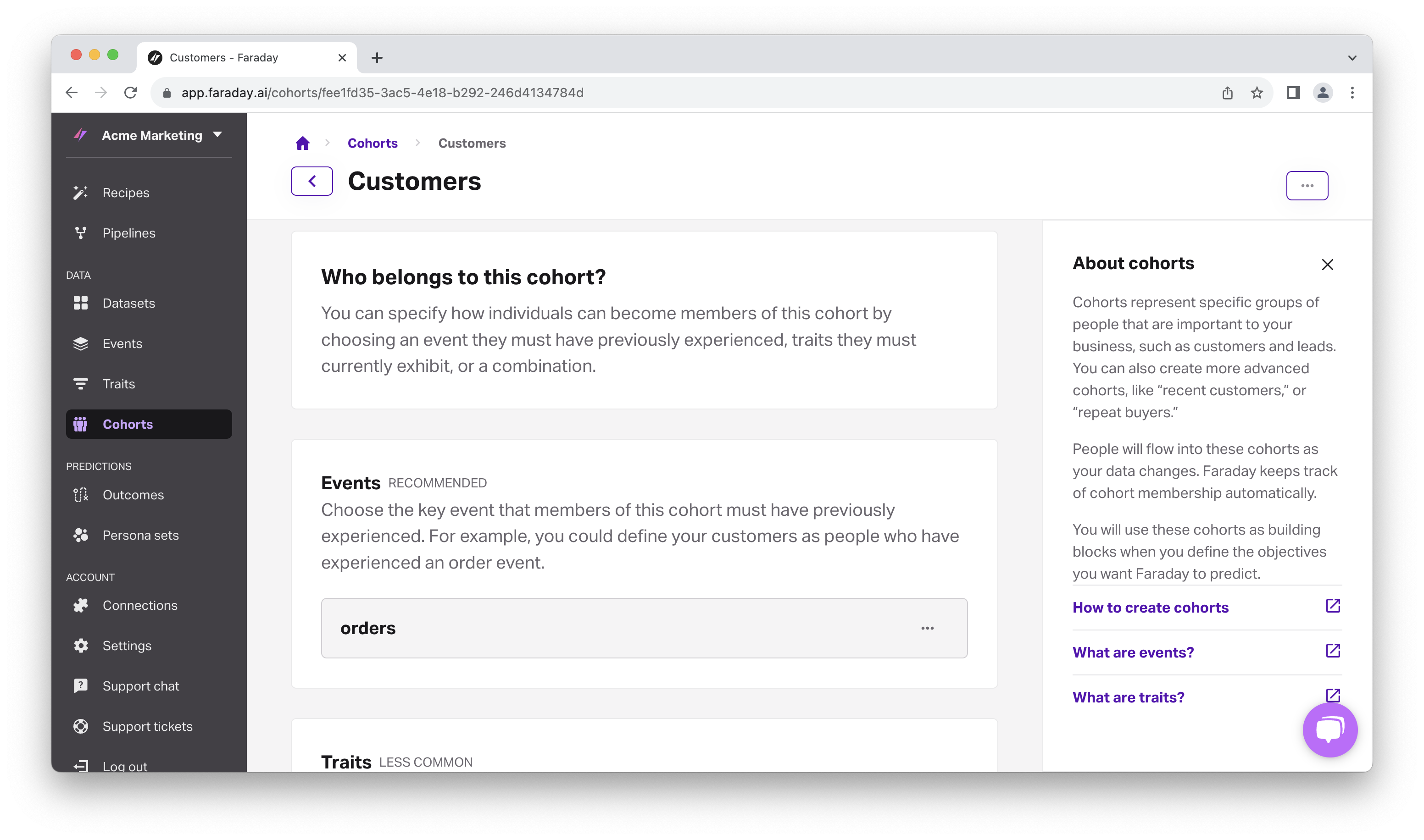 First, you’ll map your customer data to the matching Faraday properties. Then, in cohorts, you’ll build a cohort for your current customers by defining the event that makes them a customer, such as a purchase.