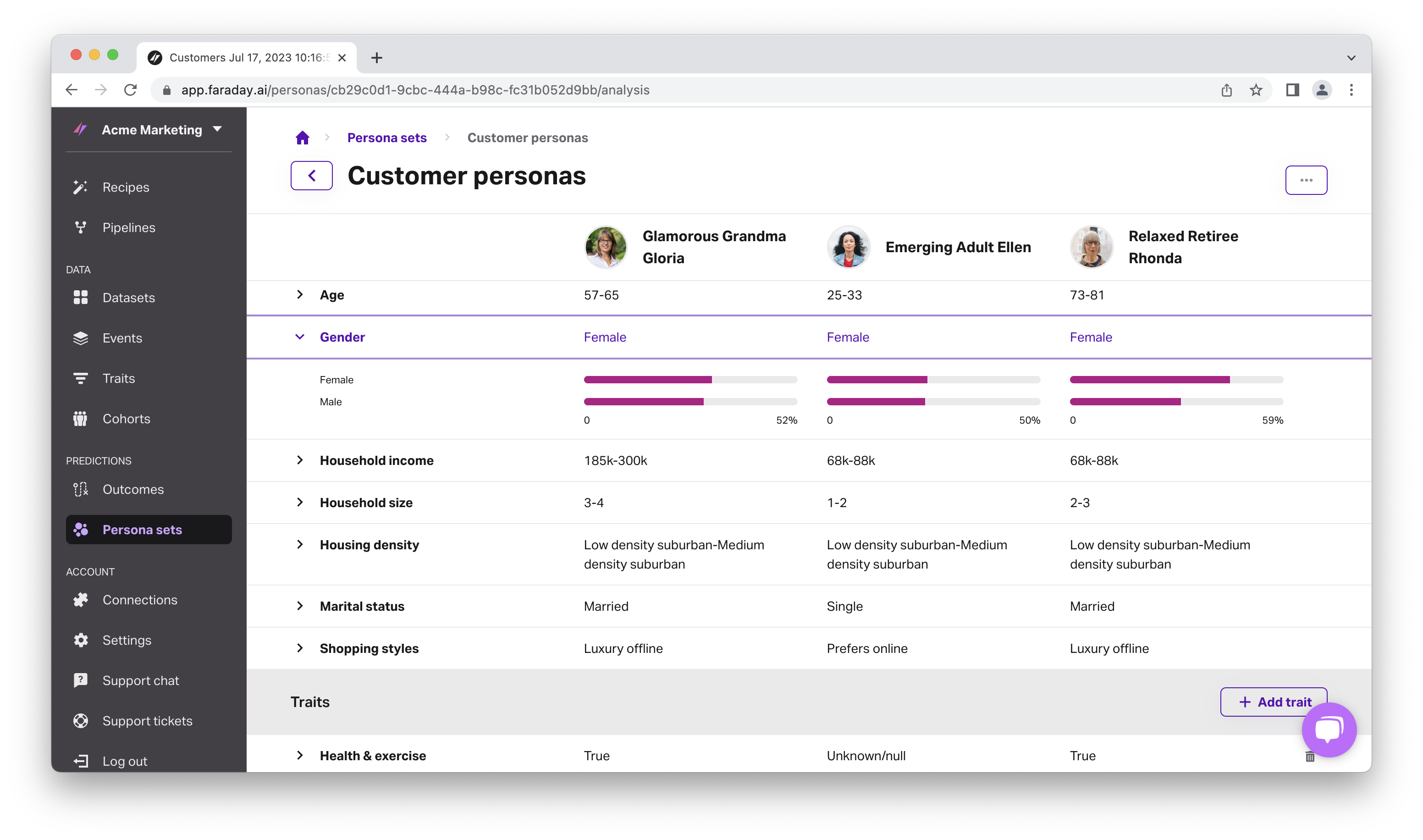 Predict personas with the help of Faraday’s rich, cookieless, opt-in consumer data on top of your own first-party customer data. Discover trait breakdowns like hobbies, shopping styles, gender, household income, and more to understand the nuances of how different portions of your customer base stand apart from each other. These breakdowns give you crystal-clear guidance on how to speak to your customers in a way that makes them feel understood.