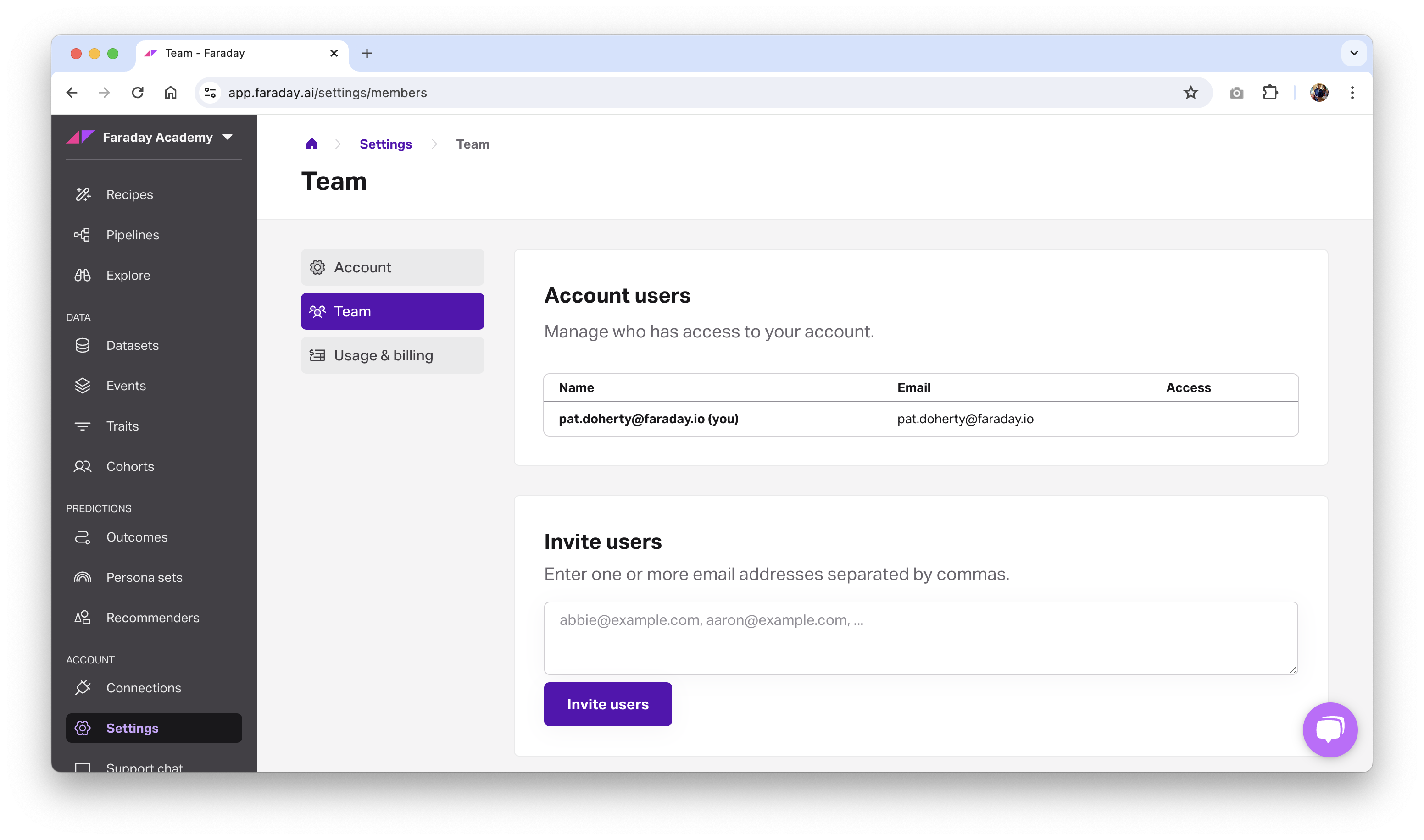 Faraday allows for easy collaboration with teammates and colleagues. Access the settings page underneath account on the left-hand navigation bar, select the team tab, enter the email address of the user you'd like to invite, and click invite.