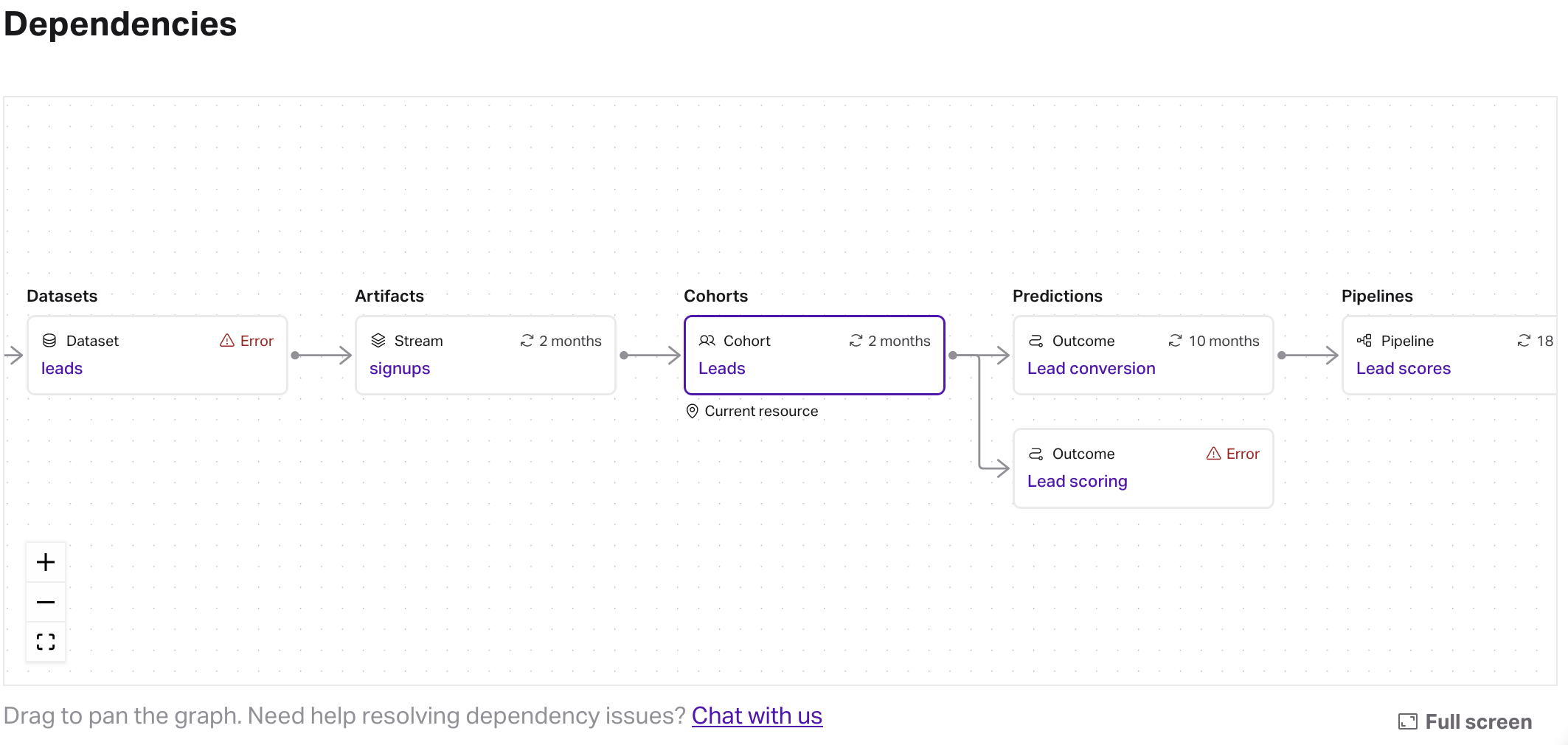 In Faraday, any given resource can be connected to one or more other resources, which we call dependencies. For example, a cohort you’ve built might be used to define an outcome, which is then used in a pipeline. To help visualize this in the Dashboard, each resource contains a dependency graph that shows which resources are connected to the one you're currently viewing.